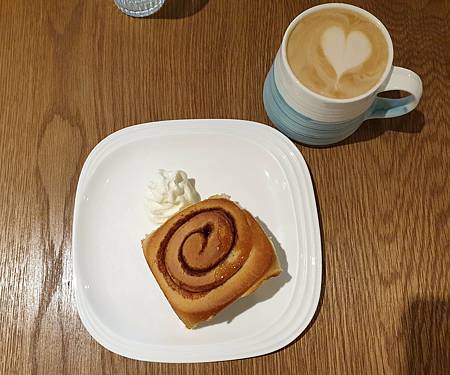 肉桂捲總共有三種口味,我點的是原味的。我覺得皮烤得有點乾乾的,因為真的太久沒有吃肉桂捲,不太清楚是不是肉桂捲就是要外皮烤的乾乾的才好吃。這個肉桂捲沒有太多肉桂的嗆味,不錯,但內部的糖漿稍嫌不足。他還有很多其他口味的肉桂捲,下次再去挑戰。